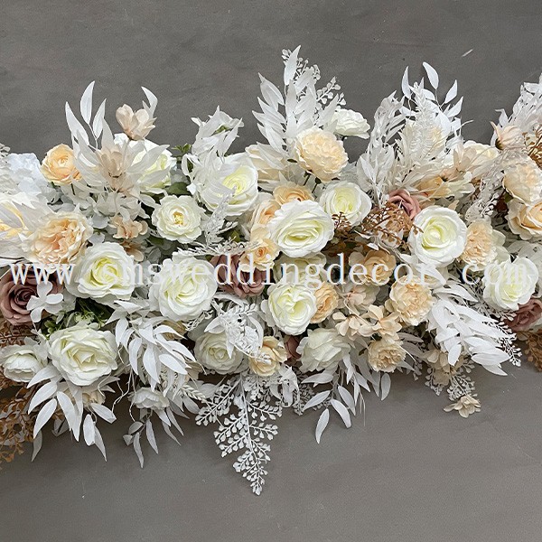 Este arreglo floral de mesa larga utiliza rosas blancas y champaña como material floral principal, acentuado con rosas antiguas, lo que agrega un toque vintage premium a una base lujosa. El arreglo alrededor de este arreglo floral de mesa de novios hace eco de los colores de las flores, manteniendo la armonía de todo el arreglo.